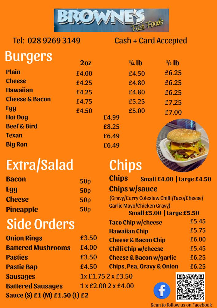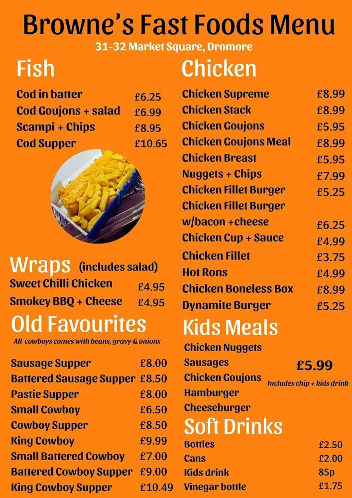 Nestled in the heart of Dromore, Browne's Fast Foods stands at 31-32 Market Square, making it a central hub for locals and visitors. This vibrant area welcomes tourists and university students, transforming lunchtime into a bustling social scene. The accessibility features, including a wheelchair-accessible entrance, ensure everyone can enjoy a meal here. Parking is convenient, as the area offers free street parking, adding to the ease of visiting this beloved chippy.